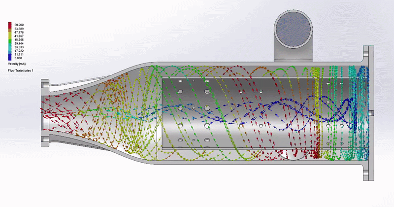 Currently, only CFD simulating the airflow from the compressor has been calculated. The goal was to ensure the air dilution into the flame tube would not blow out the flame while ensuring a proper 15:1 air/fuel ratio was met.